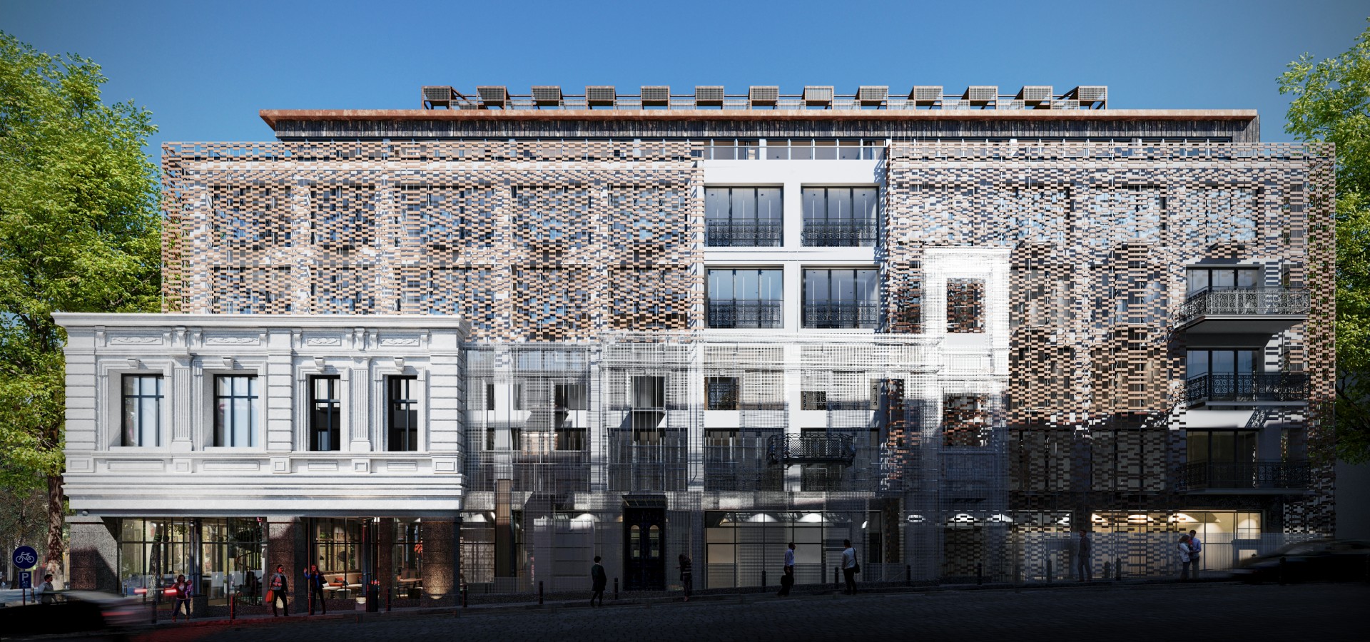 While most architectural elements of the old building are lost, a sense of history is preserved by transmitting the feeling of the old facade to the inner side of the facade wall. This approach aligns with modern architecture principles by blending historical inspiration with contemporary materials. Based on the Latest Architecture of record, a balance between architectural solutions and material selection was achieved for the facade. Practical solutions for balconies, the roof deck, the roof itself, the skylight, and the main entrance result in a sophisticated and refined appearance.