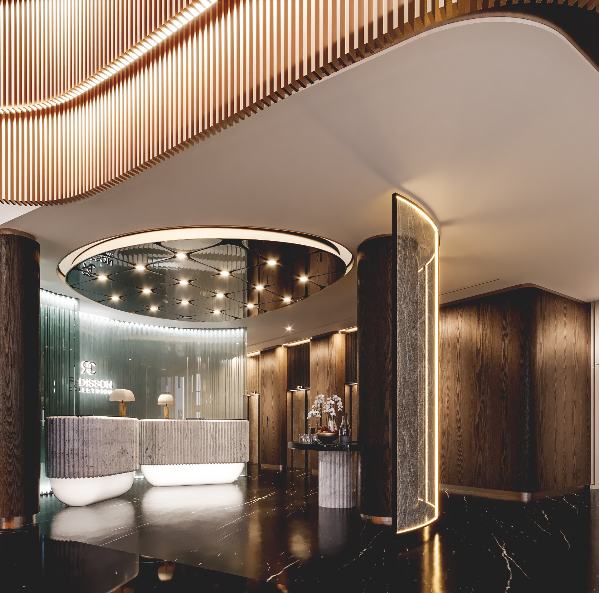 Each space is designed with careful thought for function, practicality, and the sense it should evoke. From the lobby, bar, and restaurant to bedroom suites, the planning, shapes, forms, textures, and color palettes all support the intention to deliver a proper sense of place—a place where premium lifestyle meets sophistication, with areas featuring authentic local influence that support a vibrant social scene and memorable experiences. The elegant and adaptable public spaces represent a free flow that seamlessly transforms from one to another. While considering Radisson Collection standards, the layout is crafted with careful thought about the guest’s comfort and their memorable experience. Every piece of furniture, accessory, texture, and material is carefully selected and designed to deliver a premium lifestyle with remarkable sophistication, showcasing the best of hotel architecture.
