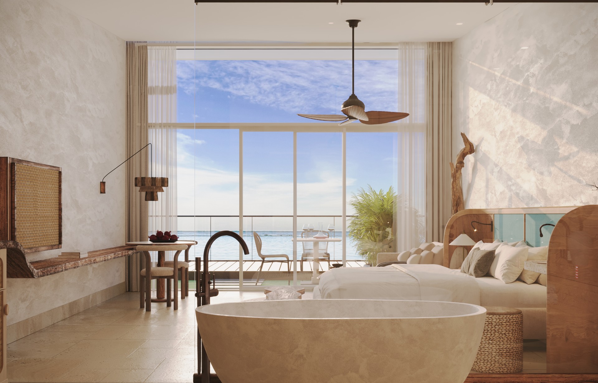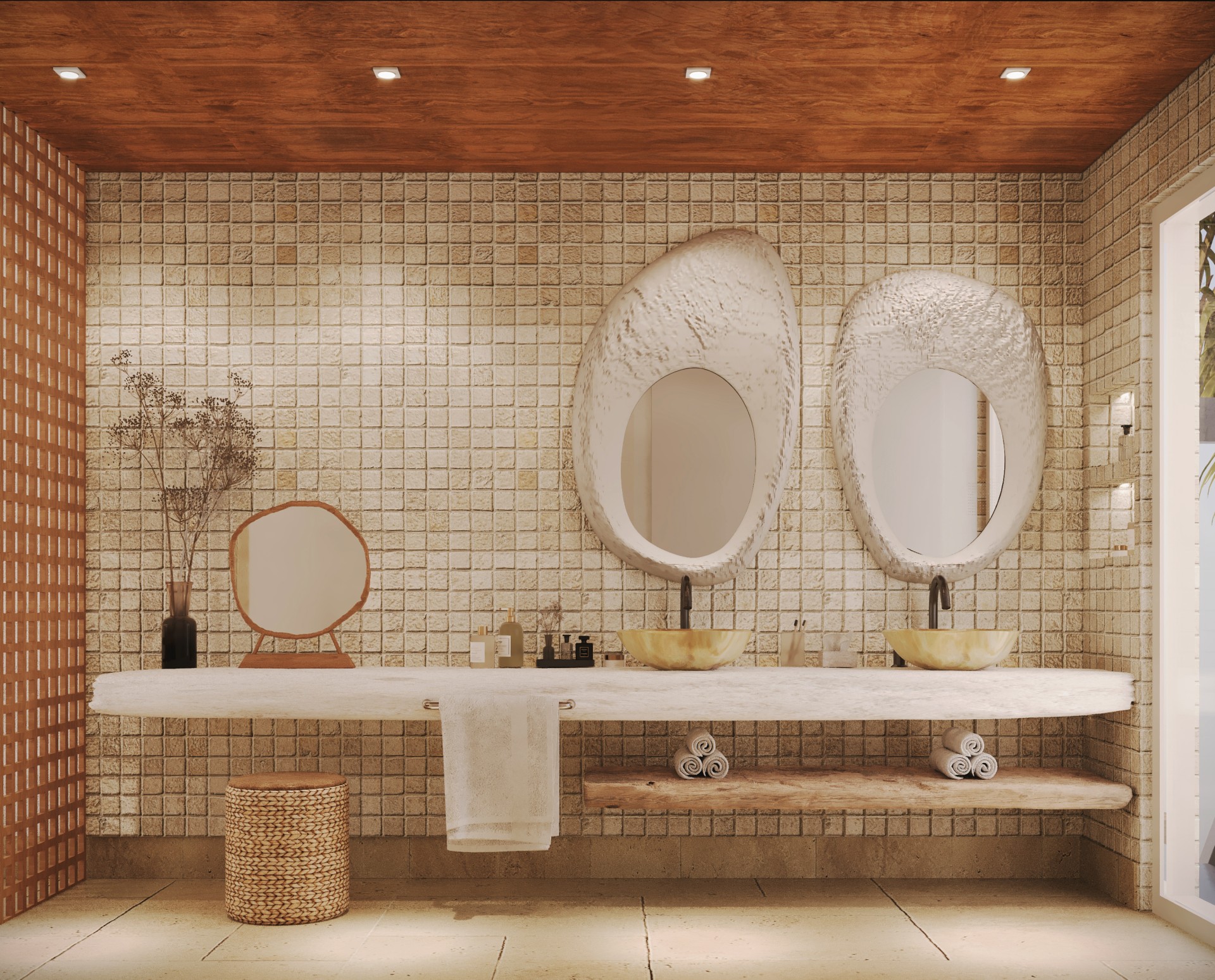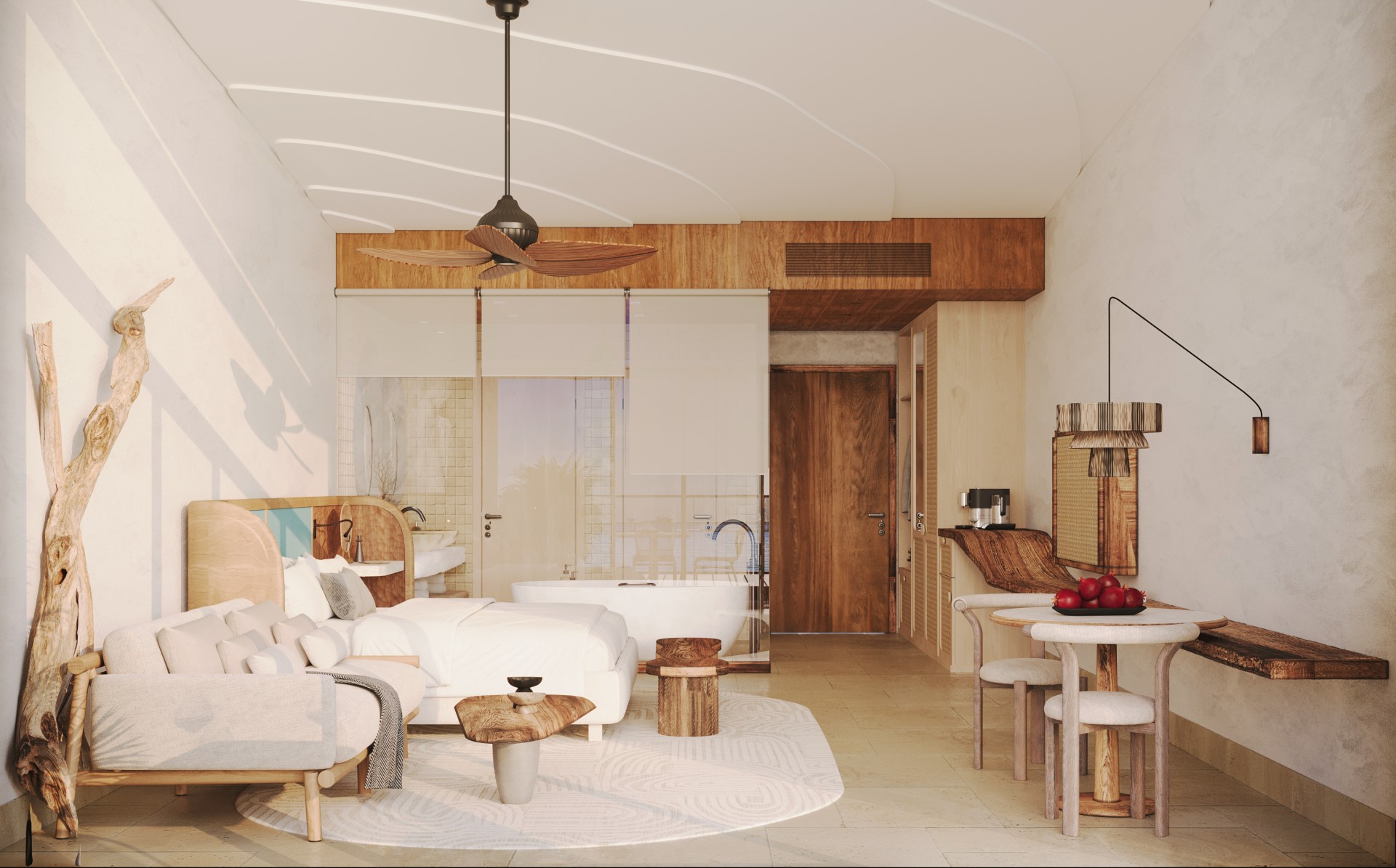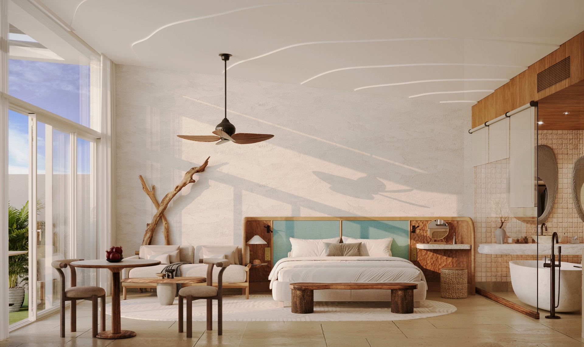 A neutral color palette evokes a sense of calm, blending earthy tones with soft hues to create a serene and welcoming atmosphere. Natural materials, sourced locally, are thoughtfully incorporated throughout, connecting the interior with the surrounding landscape. From smooth timber finishes to stone accents, every detail reflects the area’s coastal heritage. The tranquil aesthetic extends into the resort’s public areas and villas, where the design embraces clean lines, open spaces, and an uncluttered layout, fostering a sense of calm and openness. Lush greenery, carefully curated to complement the environment, enhances the peaceful ambiance, ensuring guests feel immersed in nature. This harmonious blend of local inspiration, functional design, and soothing materials provides a sanctuary where guests can unwind and reconnect with themselves and the natural world around them.