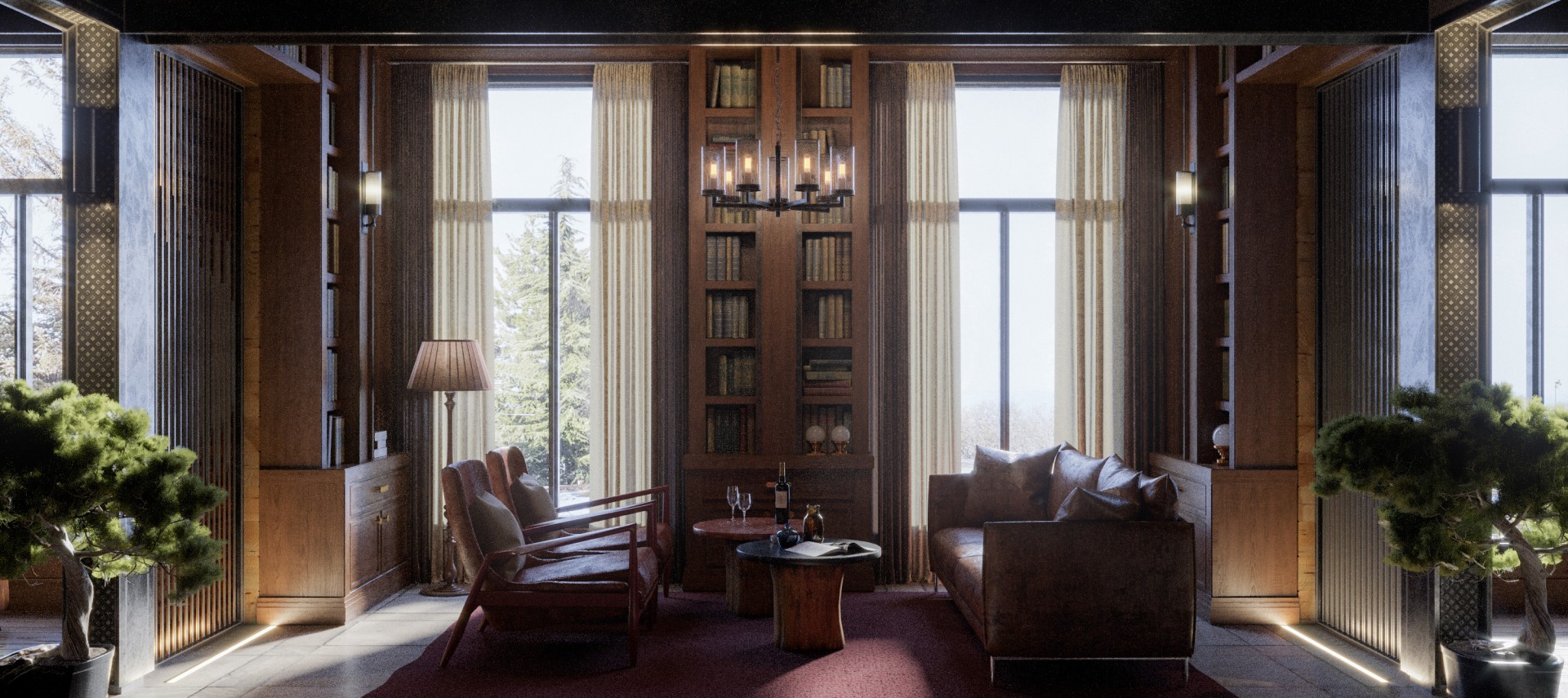 The oversized living space comprises sitting, dining, library and bar lounge areas acts as a centerpiece for the entire residence.
