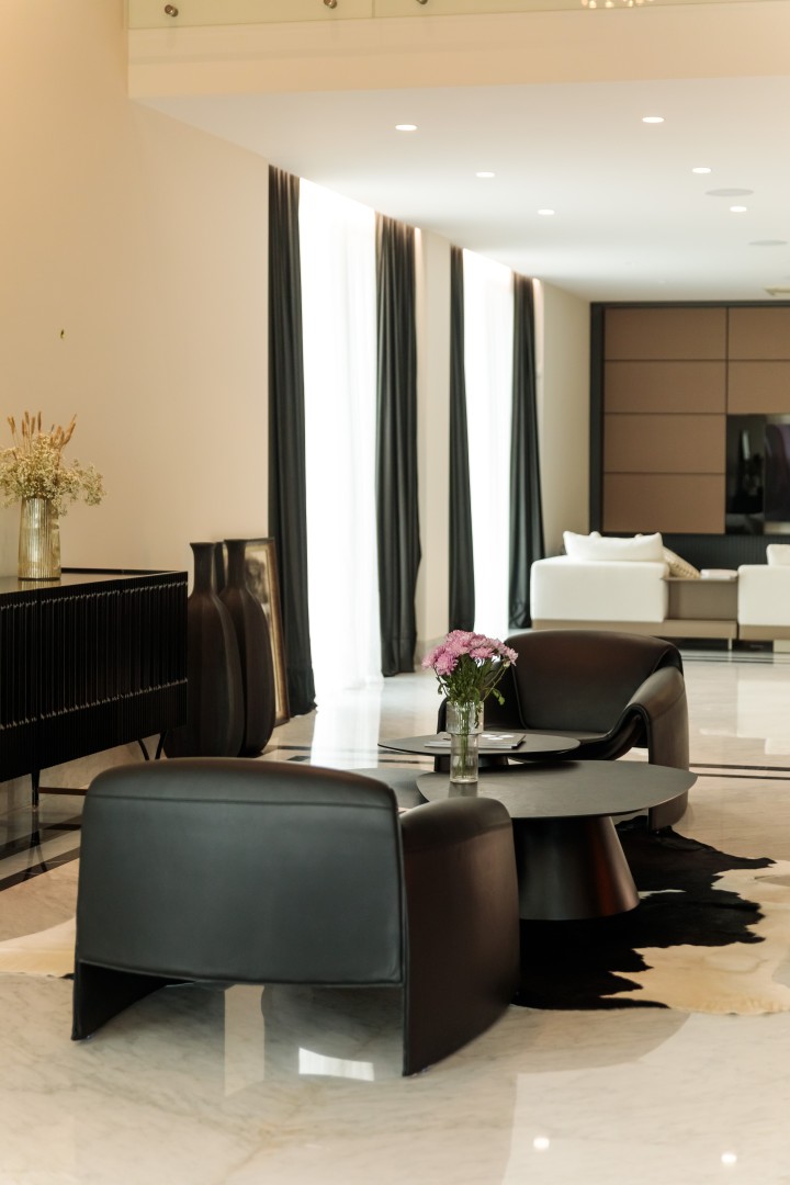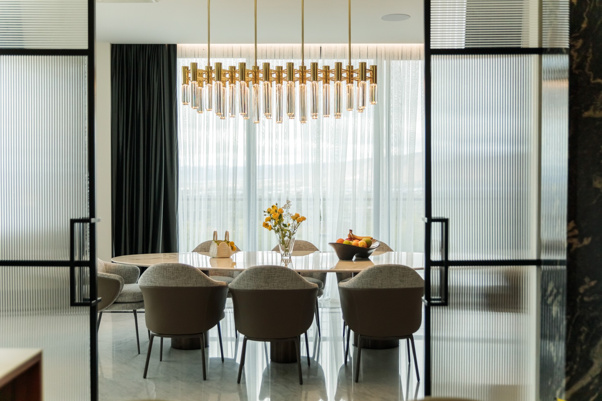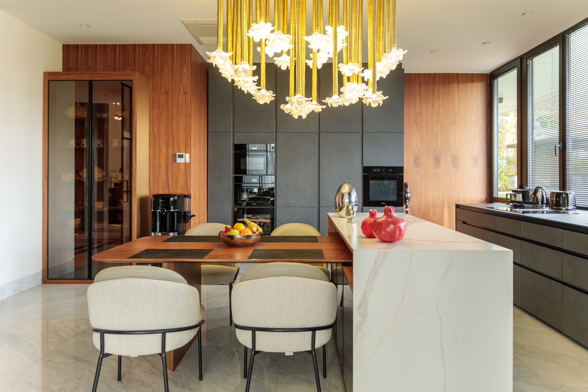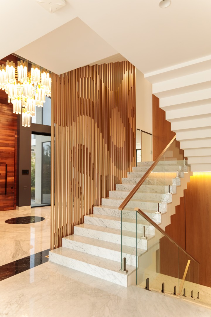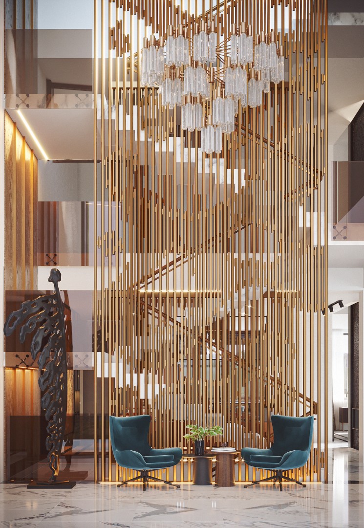 The living room is open and airy, with marble flooring and a modern chandelier bringing in shape and interest, exemplifying modern house design. The creative gold-toned staircase railing, which separates the living room and bar area from the chimney sitting area, dining room, and kitchen, is designed using custom-made metal, which elevates this architectural element from something practical to a work of art in house design. The newels, balusters, and railings of a staircase make a real design statement and bring a sense of style to the space, highlighting house design elements.