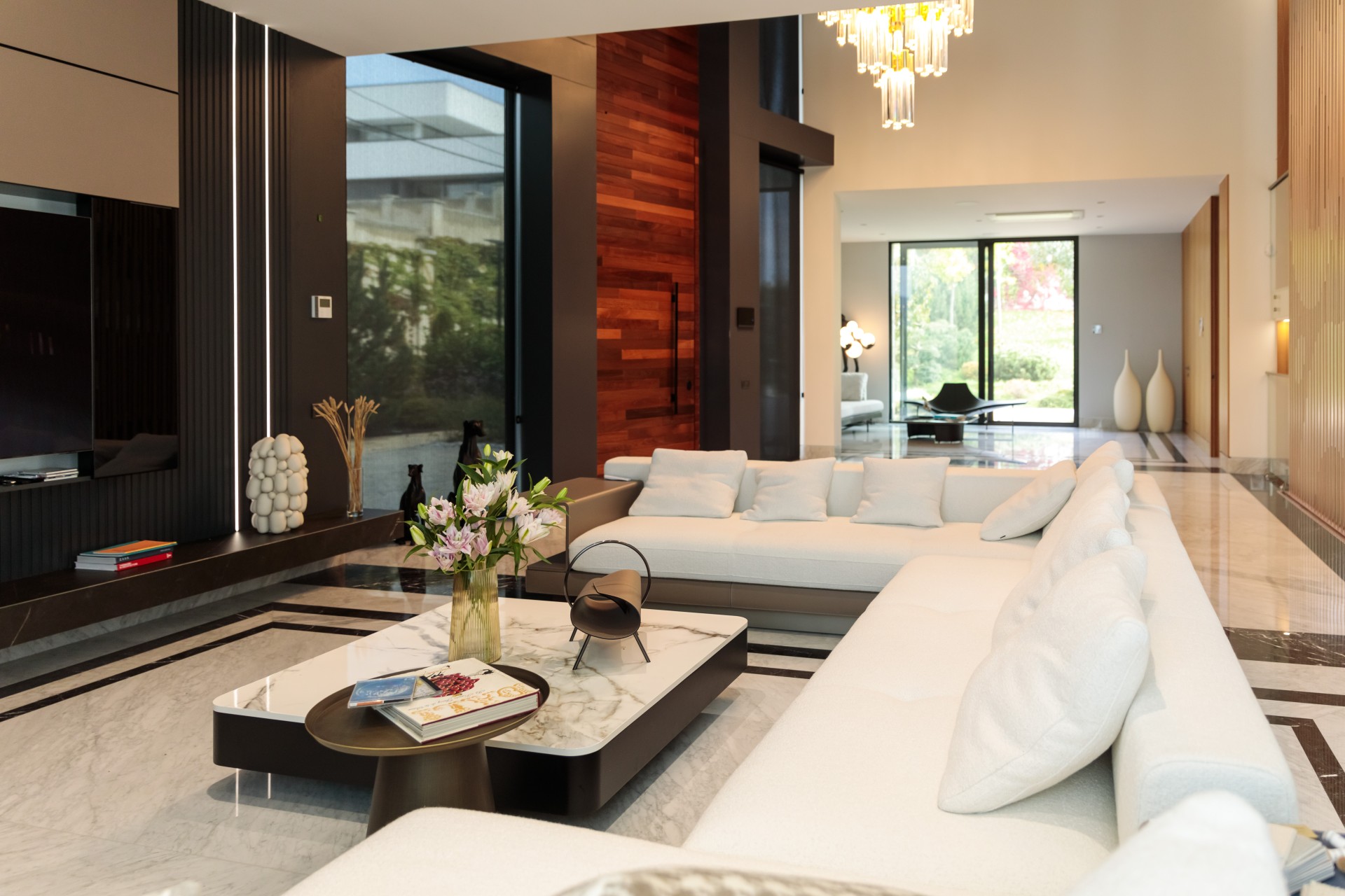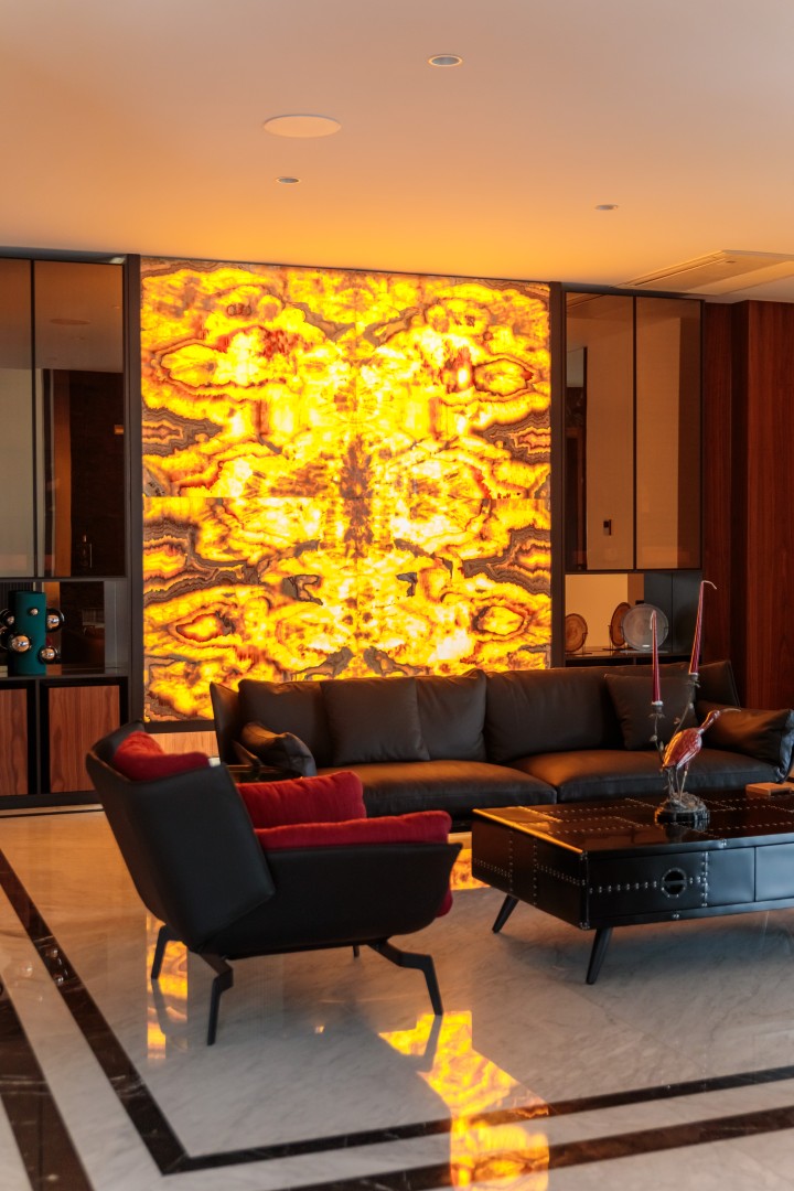 L-shaped large couch in the living room with two armchairs and a coffee table makes the perfect seating arrangement in front of the TV wall. Modern Onyx wall bar, which is backlit with LED lights to create a warm glow throughout the room is perfect for hosting, while open shelving provides storage and display, showcasing elegant house design.