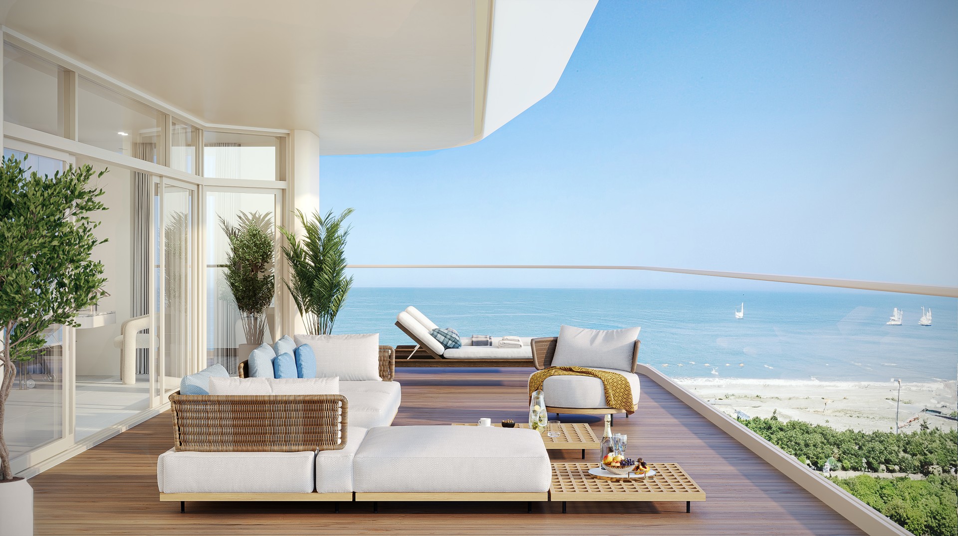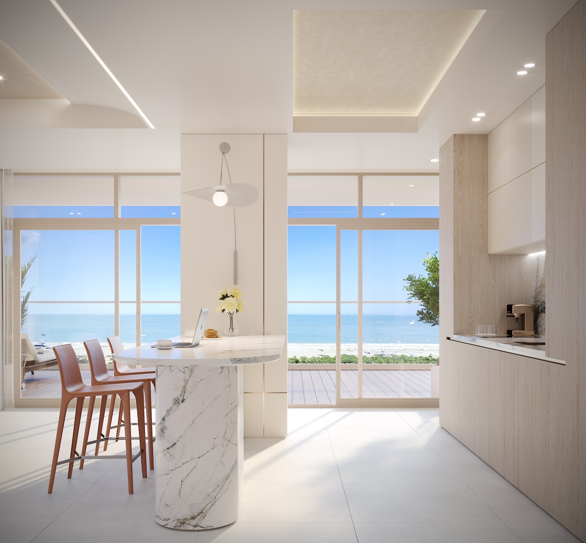 Each apartment is designed to make the most of the breathtaking panoramic views, whether overlooking the glistening sea or the lush botanical garden. Expansive floor-to-ceiling windows invite abundant natural light into the space, connecting residents to the outdoors.