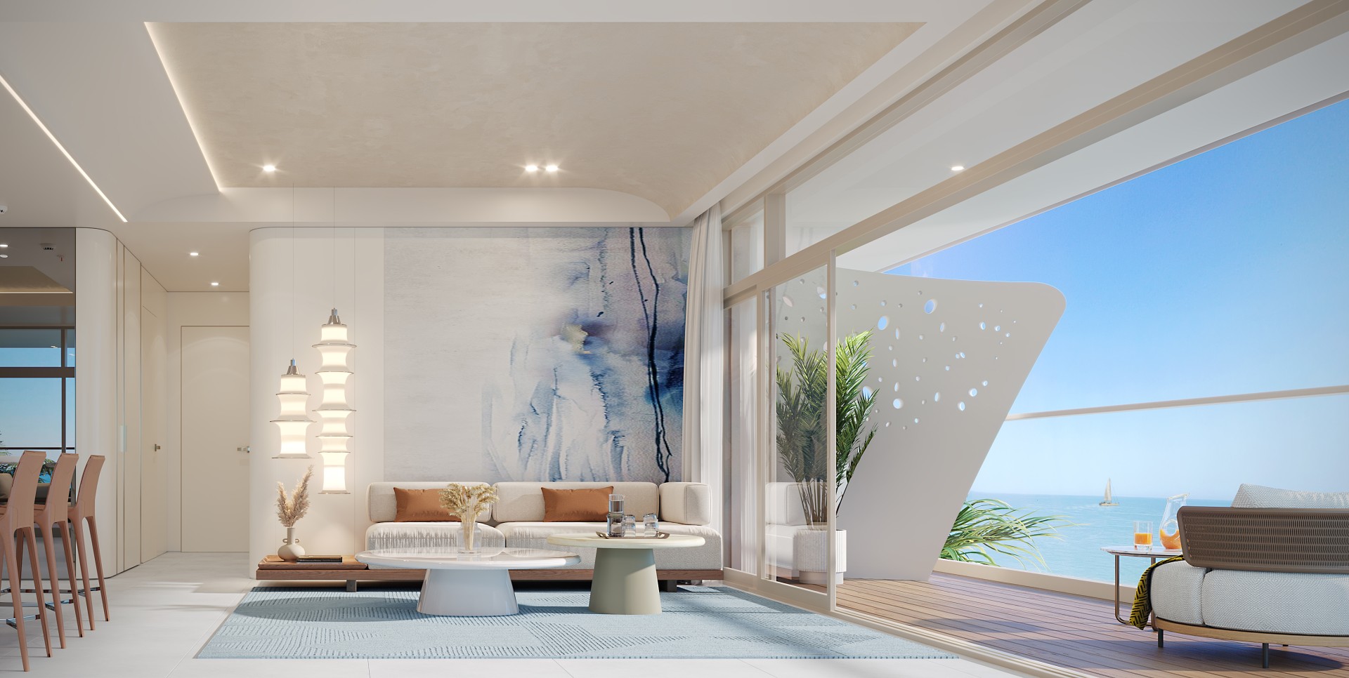 The interiors are anchored by a soothing neutral color palette, enriched with warm tones to create a calm and welcoming atmosphere. Subtle blue accents and organic shapes throughout the space serve as thoughtful references to the nearby sea, adding a layer of depth and continuity to the design.