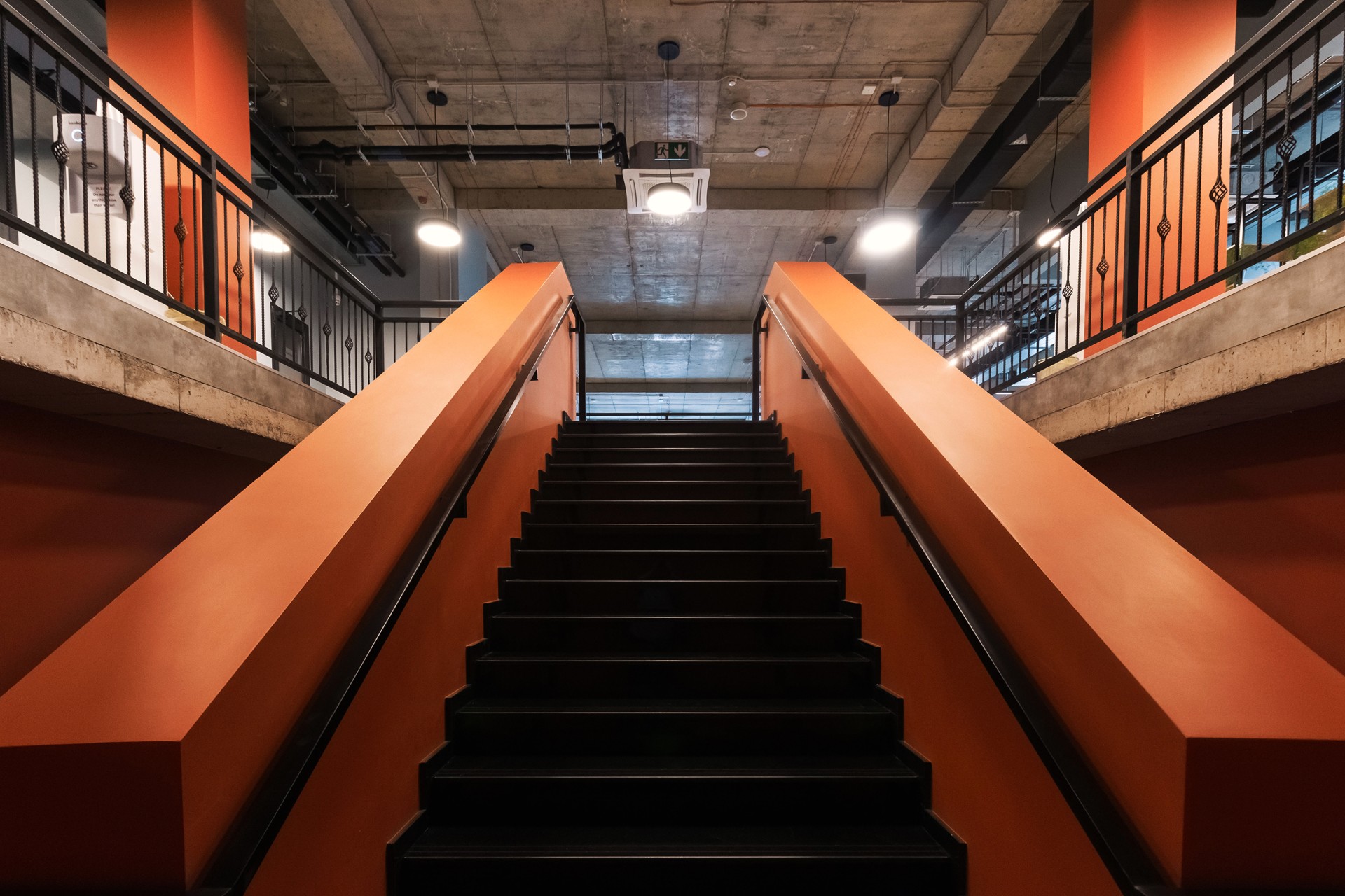 The layout spans three levels of a commercial building situated on sloping terrain, offering a unique architectural perspective. Accessible from the main entrance, the ground floor features a welcoming reception, lounge, and key coworking areas. The intermediate level includes meeting rooms, phone booths, and an academy designed for training and professional development. The lower level, accessible from the backyard, houses the auditorium, canteen, kitchenette, and additional office spaces, ensuring every functional requirement is met.